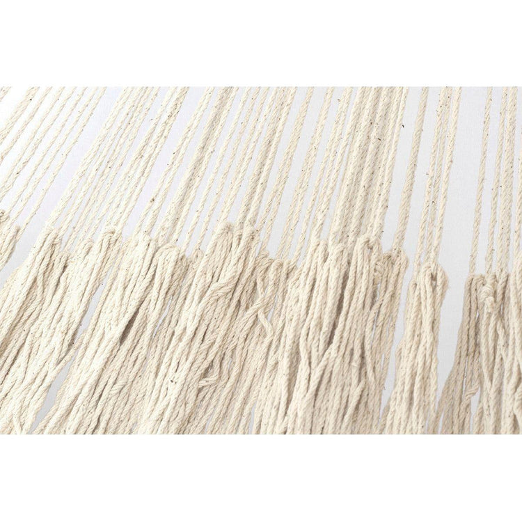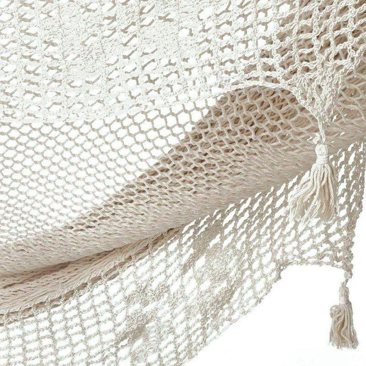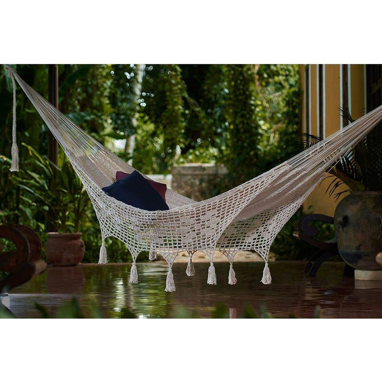 This gorgeous generous-sized hammock will quickly turn into your new favorite afternoon spot. Mayan Legacy artists hand-weave it from 100% cotton rope in elegant colours and add a beautiful crocheted fringe with tassels and floral designs for a glamorous finish. Just add a pair of straps or a frame and enjoy.