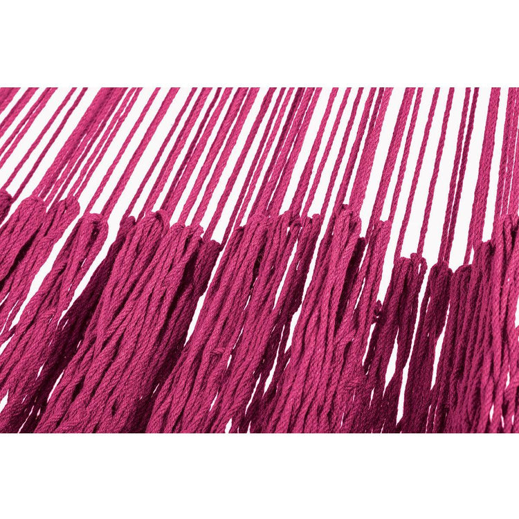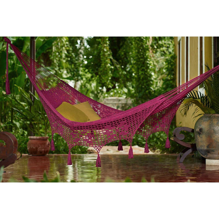 This gorgeous generous-sized hammock will quickly turn into your new favorite afternoon spot. Mayan Legacy artists hand-weave it from 100% cotton rope in elegant colours and add a beautiful crocheted fringe with tassels and floral designs for a glamorous finish. Just add a pair of straps or a frame and enjoy.