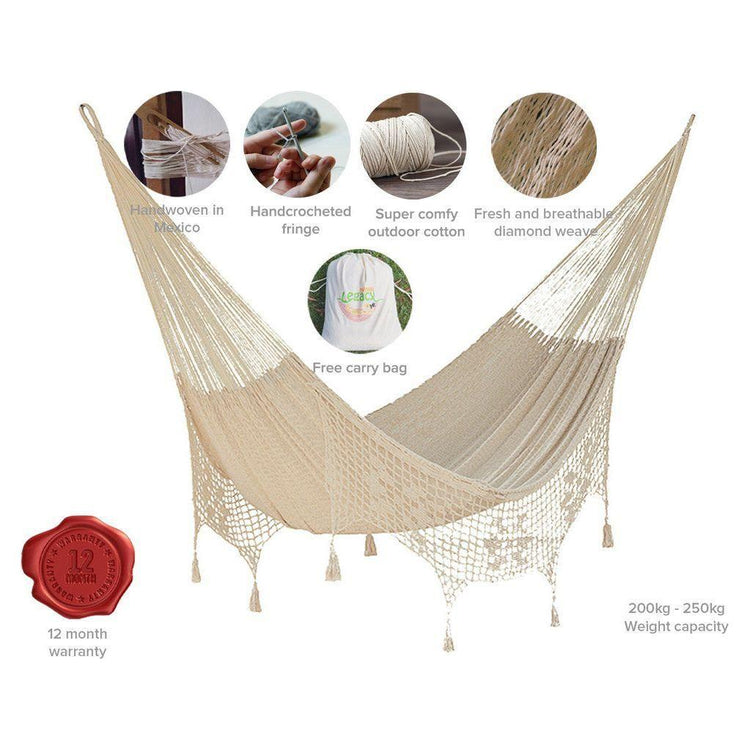 - Genuine, handwoven in Mexico supporting the tradition of weaving hammocks from home.
