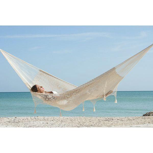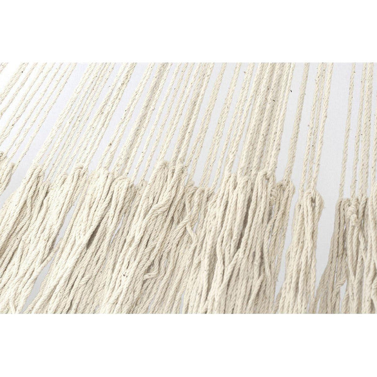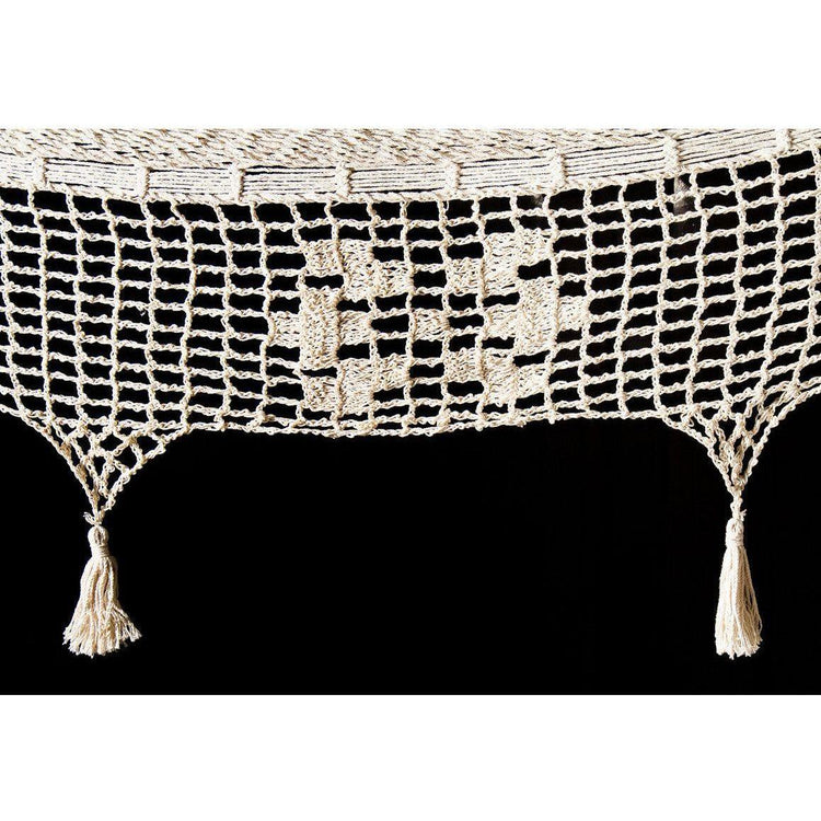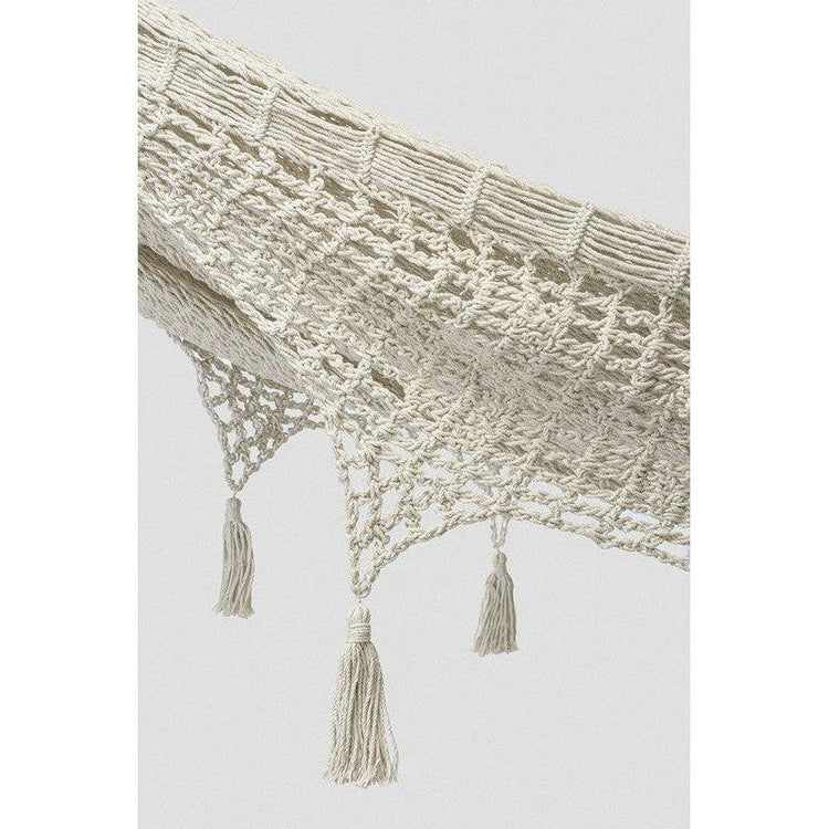 This gorgeous generous-sized hammock will quickly turn into your new favorite afternoon spot. Mayan Legacy artists hand-weave it from 100% cotton rope in elegant colours and add a beautiful crocheted fringe with tassels and floral designs for a glamorous finish. Just add a pair of straps or a frame and enjoy.