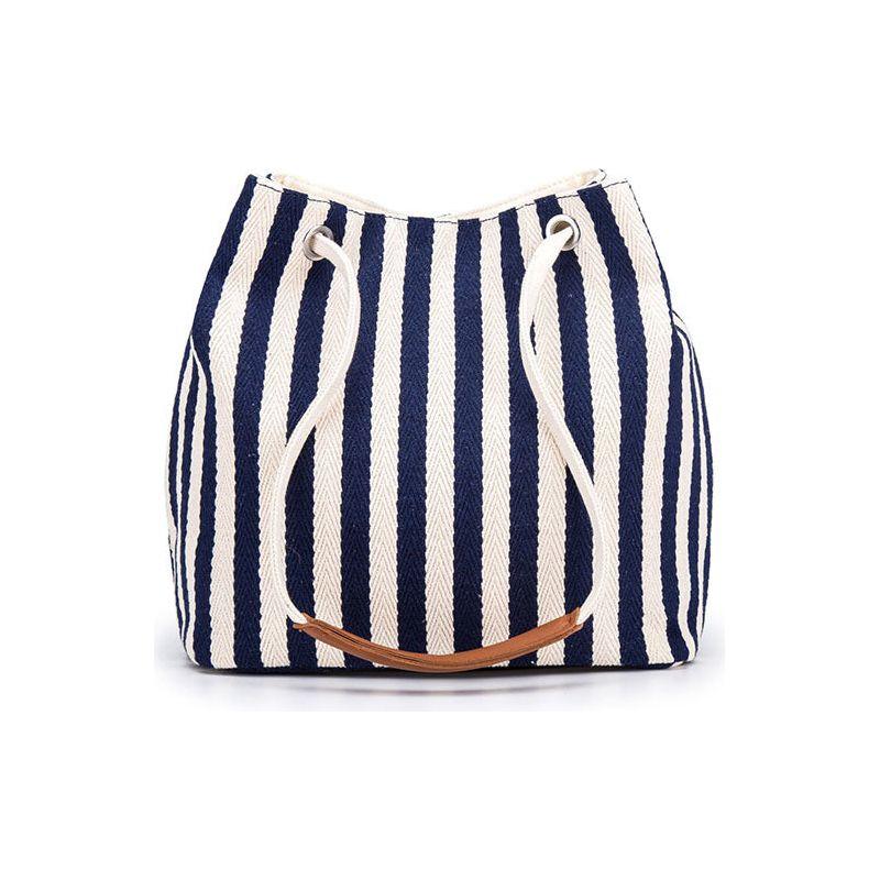 Blue Stripes Canvas Bucket Tote Bag with Leather Handle