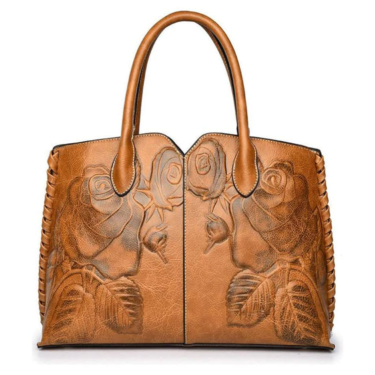 Elegant Embossed Rose Leather Handbag - Vintage Style Tote Bag