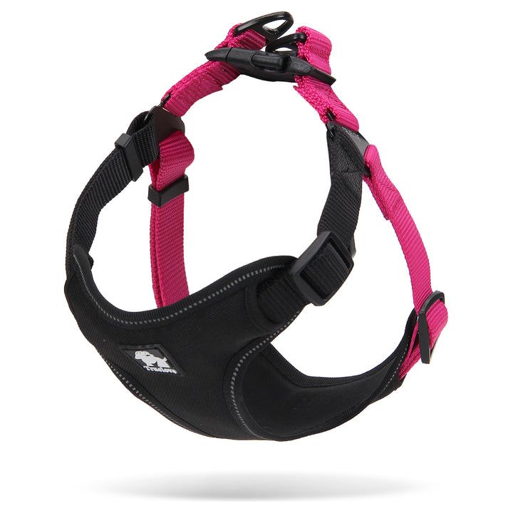 This colourful Harness comes in four different colours. The harness is super easy to adjust with four adjustable straps to fit your Dog comfortably. Two attachment points for extra control. This harness is designed to attach your leash to the back, neck and under the stomach area. This harness is perfect for driving in the car and easy to attach a seat belt hook by using the handle on the back.