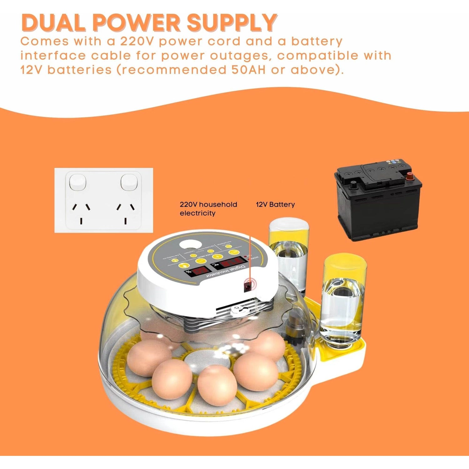 Equipped with a reliable dual power supply system, this incubator ensures uninterrupted operation by seamlessly switching to a 12V battery (not included) during power outages. With the additional 18-egg tray, you can also incubate small bird eggs, making it perfect for hobbyists and educational use.