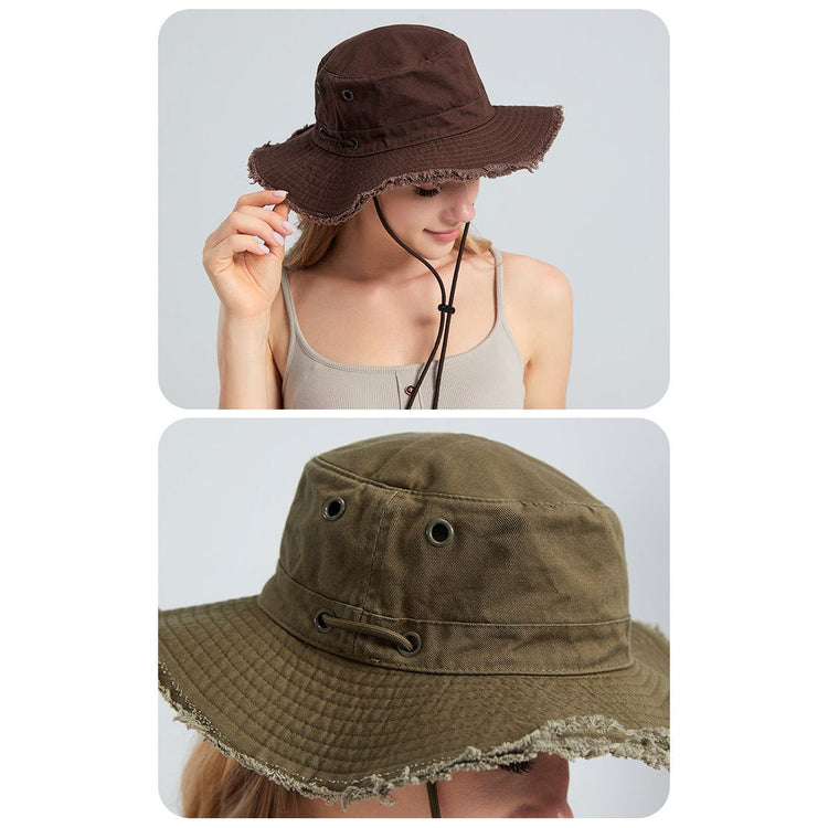- Features: Foldable into pouch/bag, Frayed Edge, 100% Cotton, Adjustable Chin Strap, Sun Protection, Breathable, Packable