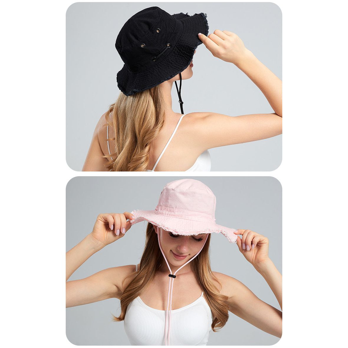 • Features: Foldable into pouch/bag, Frayed Edge, 100% Cotton, Adjustable Chin Strap, Sun Protection, Breathable, Packable