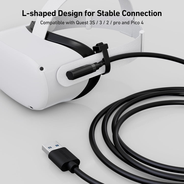 This 16ft long cable offers maximum freedom of movement in VR without feeling restricted. Its specially designed L-shaped USB-C connector enhances comfort during extended use.