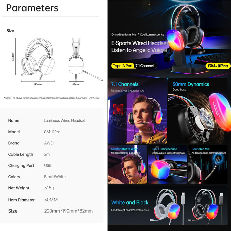 • 1 x Pro Luminous Wired Headphones 2M Cable