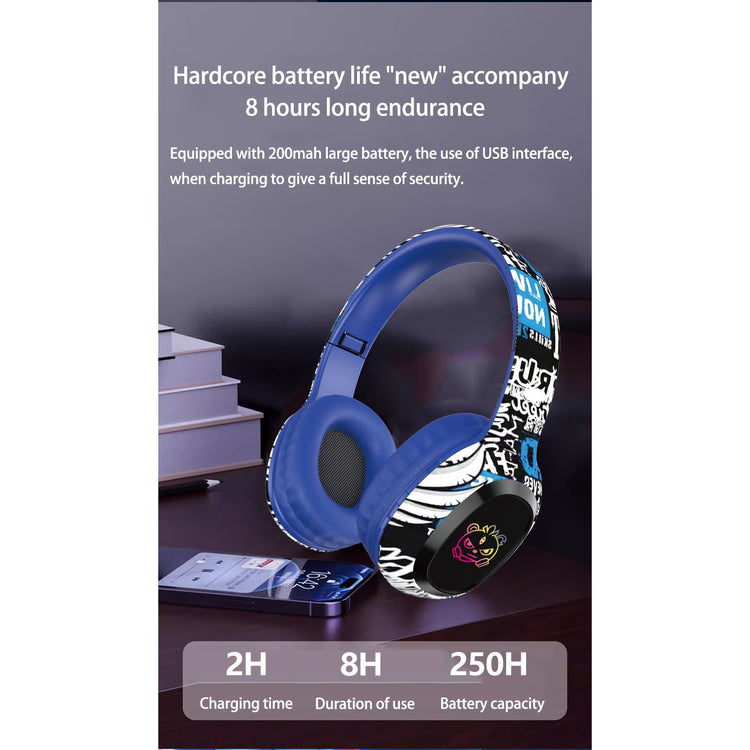 Experience immersive HIFI high-fidelity sound quality with our new presentation Wireless Over-Ear Headphones. Featuring a striking graffiti design, these headphones are equipped with 40mm custom silk composite diaphragm horns that greatly improve high-frequency resolution, delivering loud, thick bass and transparent, full mid and high tones for a music scene-like experience. Enjoy game low latency and a comfortable, skin-friendly fit with earmuffs made of imported protein skin. The headphones offer a hardcore battery life with 6-8 hours of use (some graphics show up to 8 hours) from a 200-250mAh large battery, recharging in about 2 hours via USB. With Bluetooth 5.3 for stable communication up to 10 meters and SBC audio decoding, they also feature a seven-color RGB light effect that can be turned off. Intuitive on-ear controls allow for easy management of power, mode switching, calls, play/pause, volume, and track selection.