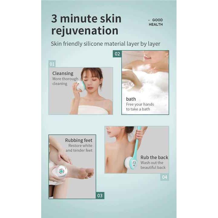 - 5 Interchangeable Brush Heads: Includes silicone face cleansing, body scrub, exfoliating foot, deep cleaning, and mud scraping heads for versatile usage.