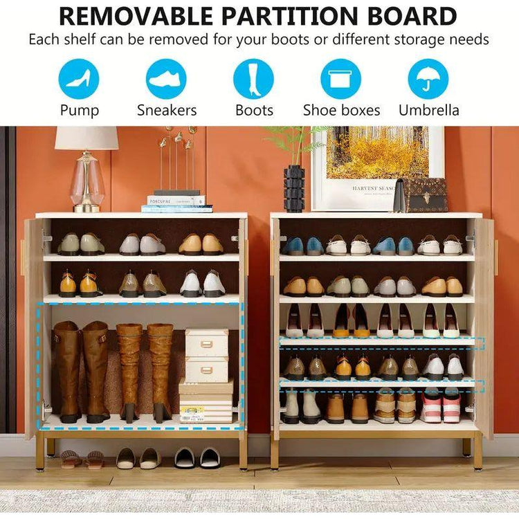 The high metal legs in gold not only add a touch of elegance but also make cleaning under the cabinet easy and convenient. The removable shelves inside allow for versatile storage, accommodating shoes of different heights and large sizes. The top of the cabinet can be used for decoration or storing daily essentials, while the bottom provides extra space for additional shoes.