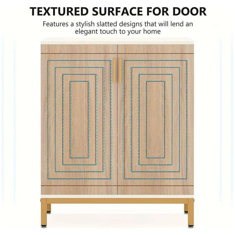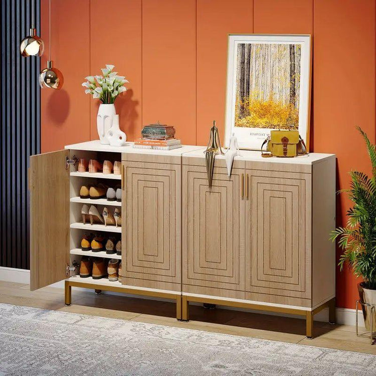Measuring 31.5" W x 15" D x 30.3" H, this shoe rack saves valuable floor space while providing ample storage. The adjustable feet ensure the cabinet remains stable on any floor surface, preventing wobbling. The sleek golden door handle adds a warm touch and protects against scratches and injuries during use.