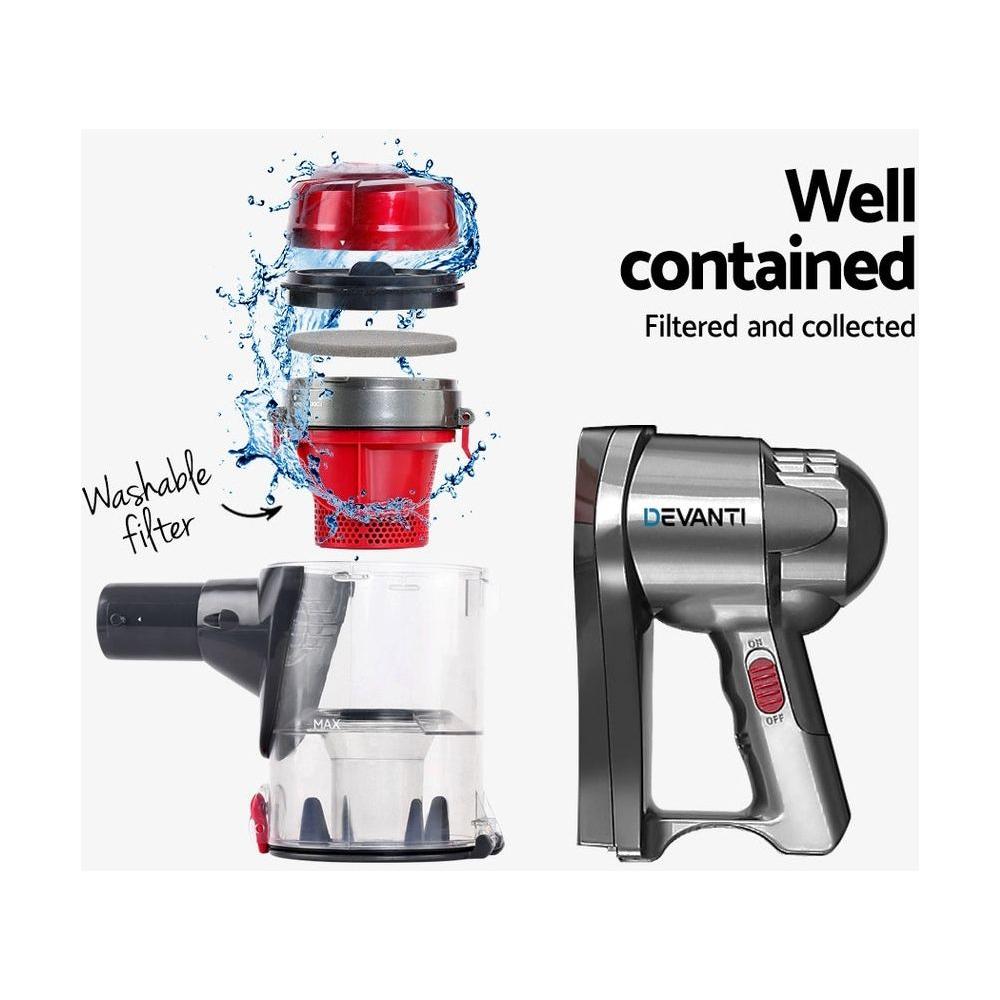 For the ultimate in easy vacuuming, the Devanti Corded Handstick Vacuum Cleaner gives you the freedom to use it in tight spaces or for spot cleaning without lugging a big machine behind. And without a battery, the corded handstick vacuum cleaner provides for longer periods of sustained vacuuming compared to cordless models.