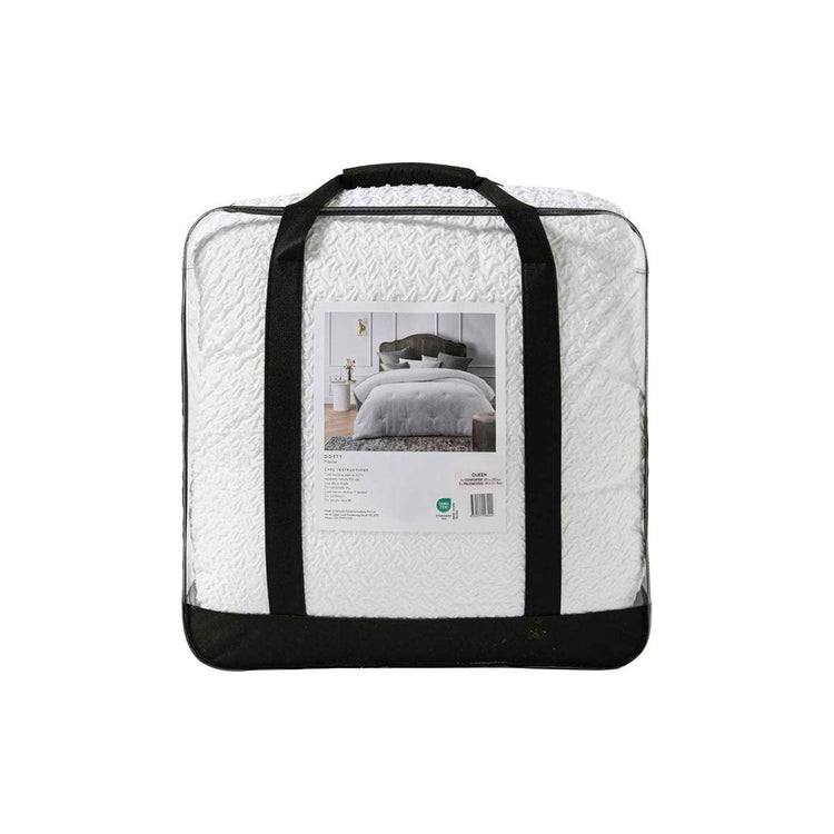 Uniquely textured with a clipped dot detail, the Dotty Clip White 3 Piece Jacquard Comforter Set by Accessorize is a beautiful update to classic white bedding. The polyester filled comforter features additional quilting detail for a warm and cosy bedroom.