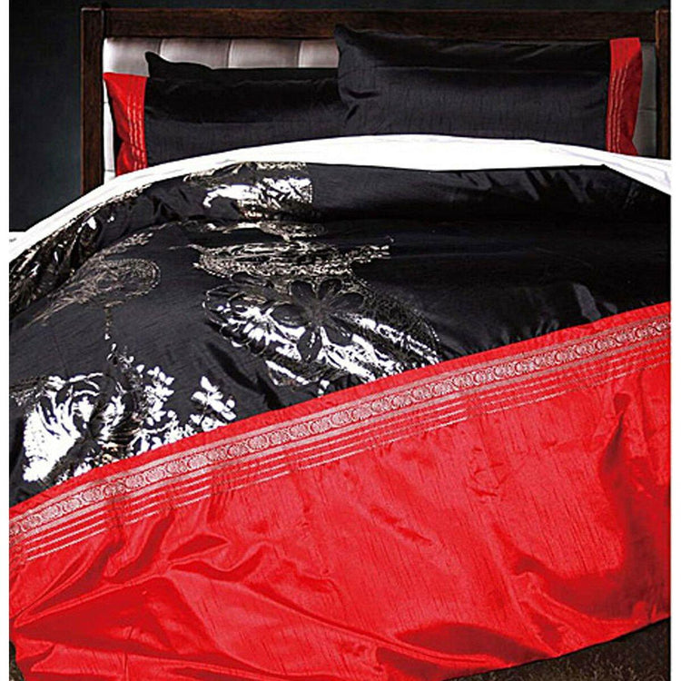 Give your bedroom an instant elegant makeover with this Majestic Black Quilt Cover Set by Accessorize. It features a lovely floral design printed in bold colour tones of black, silver, and red. The fabric is made of yarn dyed Jacquard Satin Polyester fabric with soft feel.