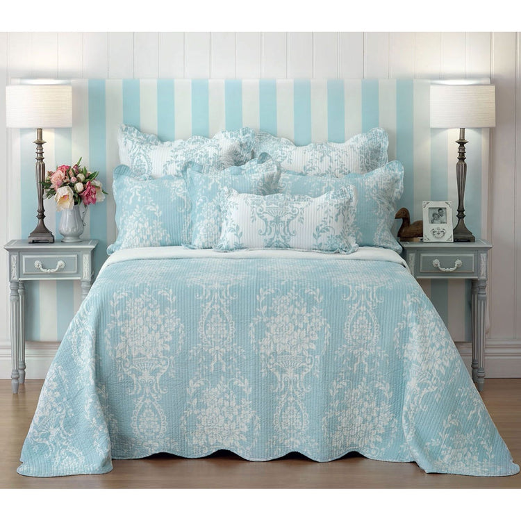 This Florence Bedspread Set or Accessories by Bianca is inspired by a french provincial boudoir and is printed on beautiful soft textured fabric in shades of light blue and white.
