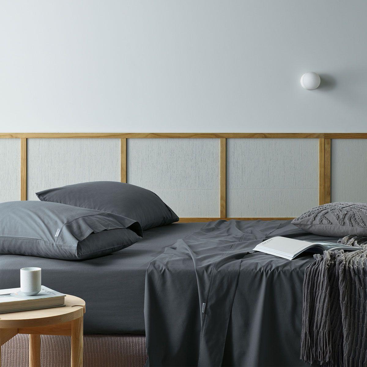 Our sustainable Natural Sleep Recycled Cotton and Bamboo Sheet Set Charcoal by Bianca is woven in an easy-care percale weave fabric. The natural properties of cotton and bamboo control moisture and regulate body temperature to ensure a beautiful night's sleep. Cuffed and piped these sheets are super soft, smooth and durable. The fitted sheet has a wall depth of 40cm which will fit most mattresses.