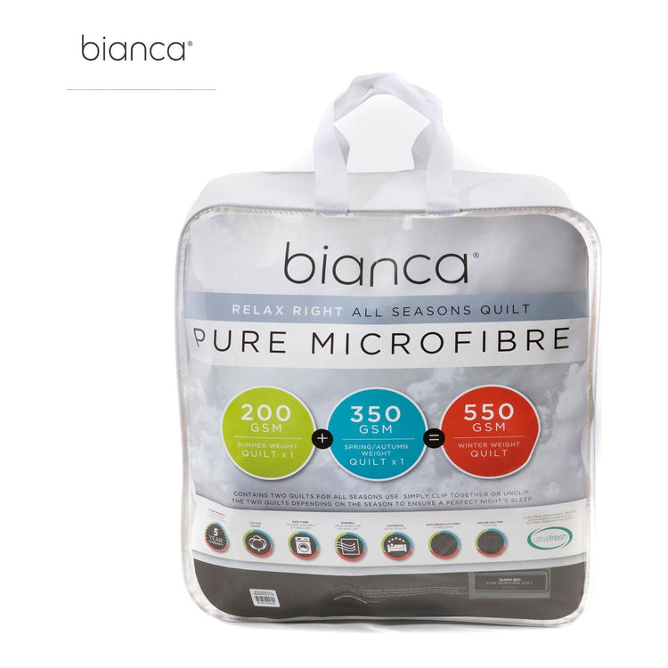 This Relax Right Pure Microfibre All Seasons Quilt by Bianca is a luxurious quilt filled with super soft microfibre and encased in a cotton cover. Quilted with a square quilting pattern and finished with satin piping in pure white cotton colour. Contains two quilts for all seasons use. Simply clip together or unclip the two quilts depending on the season to ensure a perfect night's sleep. 1 x quilt 200gsm + 1 x quilt 350gsm = combined weight 550gsm.