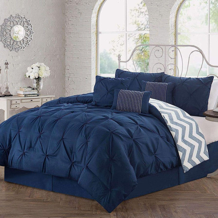 Revitalise your bedroom with this 6 Pcs Ella Navy Comforter Set by J Elliot Home that brings comfort and timeless elegance to your space. The navy and white colour tones and pleated design of this comforter set effortlessly blend with various decor styles, allowing you to create a personalised and inviting space that reflects your taste and personality. It is made from quality and soft touch Polyester fabric and Polyester filling for all year round comfort.