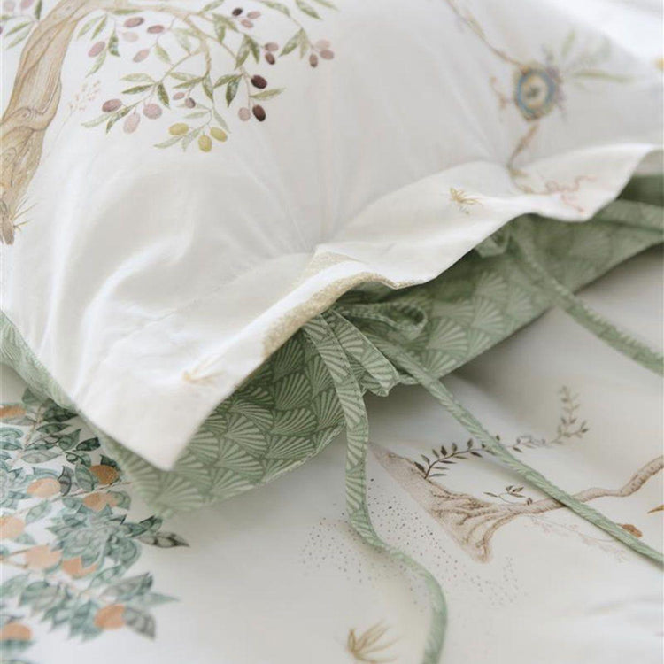 Picture yourself in the Italian country with the Giardini di Frutta White Cotton Quilt Cover Set by PIP Studio. The design features a mix of palm and fruit trees, which echo scenes from quintessential Italian landscapes - fountains, terracotta pots, garlands, and even the odd olive picker. The underside of the quilt cover has a decorative border that flows into a floral print. The back features a pattern of stylized shells. The quilt cover and pillows have a stitched Oxford border on the sides and are finished with striped piping, completing the luxurious look. The pillowcases have a tie closure and an attractive design on both sides, just like the quilt cover. Perfect for creating a quirky mix-and-match effect on your bed. The quilt cover is not only an eye-catcher in your bedroom, the use of 100% cotton percale makes the cover wonderfully soft and the 200TC weave density ensures that the fabric remains beautiful for a long time.