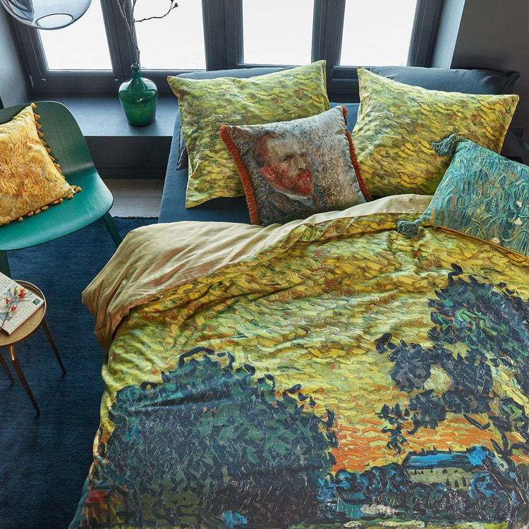 Beddinghouse is committed to designing beautiful collections with respect for people and the planet. Beddinghouse therefore participates in the Better Cotton Initiative, which aims to improve cotton cultivation worldwide. We have developed luxurious and sustainable packaging specially for the Beddinghouse x Van Gogh Museum collection. You can reuse the box for storage. The duvet cover is made of 100% cotton sateen, 220 TC with a plain yellow green at the back. The duvet cover has a chic sheen and the sateen weave makes it feel very smooth. More threads are used for a sateen weave and the material is woven much tighter. Cotton sateen is made of 100% high quality breathable cotton and is moisture-absorbent. The duvet cover can be washed at a temperature of up to 60 degrees, is suitable for the tumble dryer and can be ironed. Comes in ochre, yellow, green, blue, and orange colour tones.