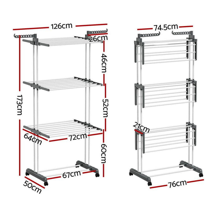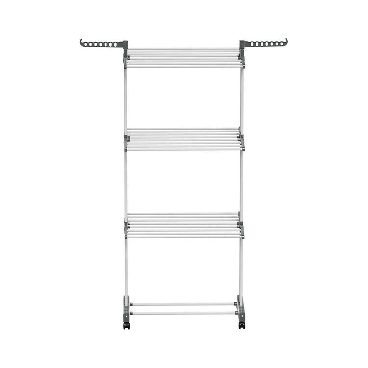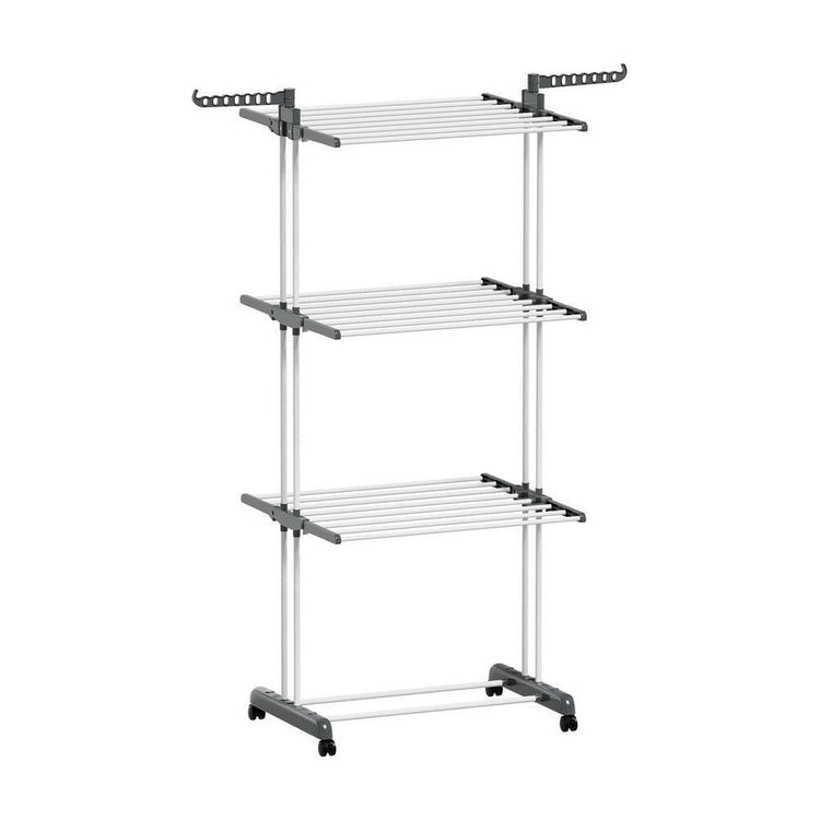 Prepare for laundry day with the heavy-duty, 3-tier Clothes Drying Rack from Artiss. The rack is constructed from sturdy powder-coated metal tubing and solid plastic and can support up to 20kg of laundry. Not only are there 3 generous tiers to hang clothes, linens and undergarments, but there are two handy side hooks that will support various hangers, and two lower bars allow for additional storage. Generous spacing between each bar allows for proper airflow, helping your clothes dry fast. The entire unit is incredibly lightweight and portable, and four convenient lockable wheels can help you move around and keep in one place as required. Once laundry day is over, simply fold the unit and store it away until needed. For fast and convenient clothes drying, look no further than the Artiss Clothes Drying Rack.