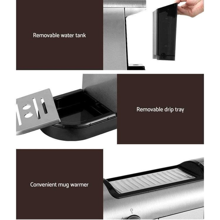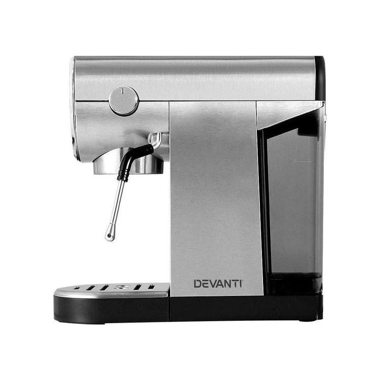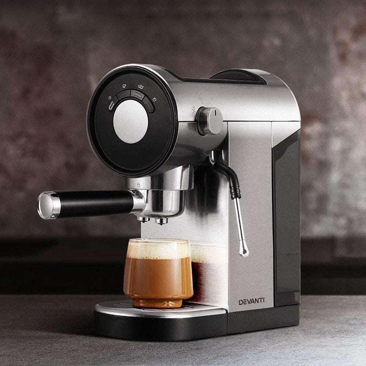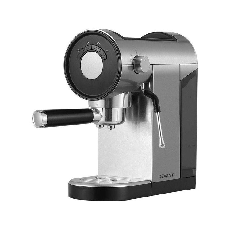 Get a head start on the day with your first cup of coffee from a Devanti Espresso Machine. Pour the perfect shot every time with easy-to-use controls, a powerful 20-bar pressure pump, and an instant heat system. The machine comes with single and double-shot coffee filters, a diecast aluminium portafilter and a dual coffee tamper/spoon - everything you need for a fresh cup. The convenient mug warmer keeps your cups at the perfect temperature as you froth your milk just the way you like it. Easily fill the machine from the removable water tank and clean it up with the removable drip tray. Its space-saving design means it won't take up your entire benchtop, giving you plenty of room for your other kitchen essentials. Relax and enjoy your favourite coffee from the comfort of your home with your very own Devanti Espresso Machine.