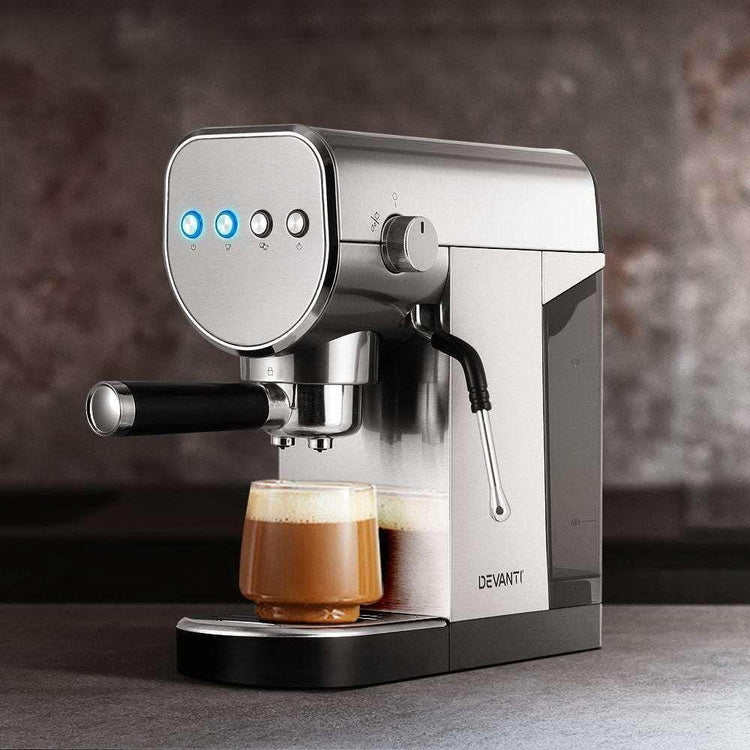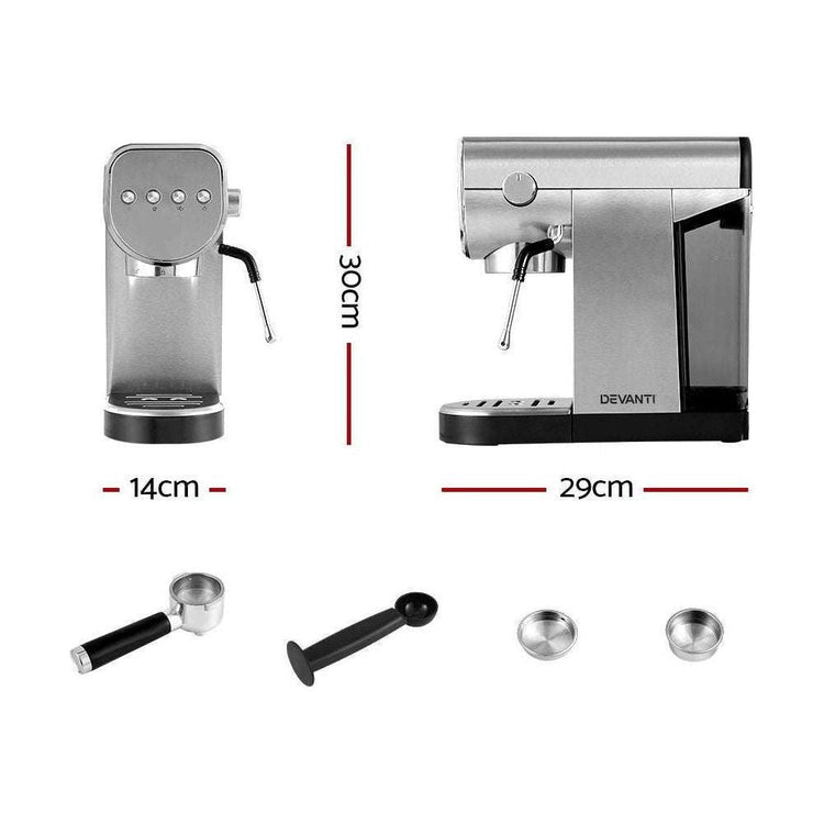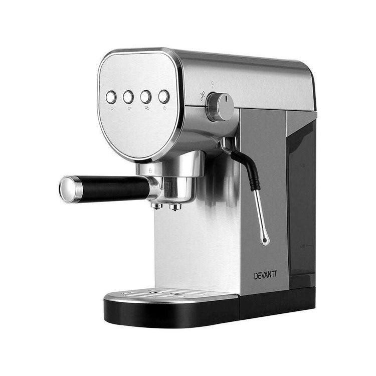 Get a head start on the day with your first cup of coffee from a Devanti Espresso Machine. Pour the perfect shot every time with easy-to-use controls, a powerful 20-bar pressure pump, and an instant heat system. The machine comes with single and double-shot coffee filters, a diecast aluminium portafilter and a dual coffee tamper/spoon - everything you need for a fresh cup. The convenient mug warmer keeps your cups at the perfect temperature as you froth your milk just the way you like it. Easily fill the machine from the removable water tank and clean it up with the removable drip tray. Its space-saving design means it won't take up your entire benchtop, giving you plenty of room for your other kitchen essentials. Relax and enjoy your favourite coffee from the comfort of your home with your very own Devanti Espresso Machine.