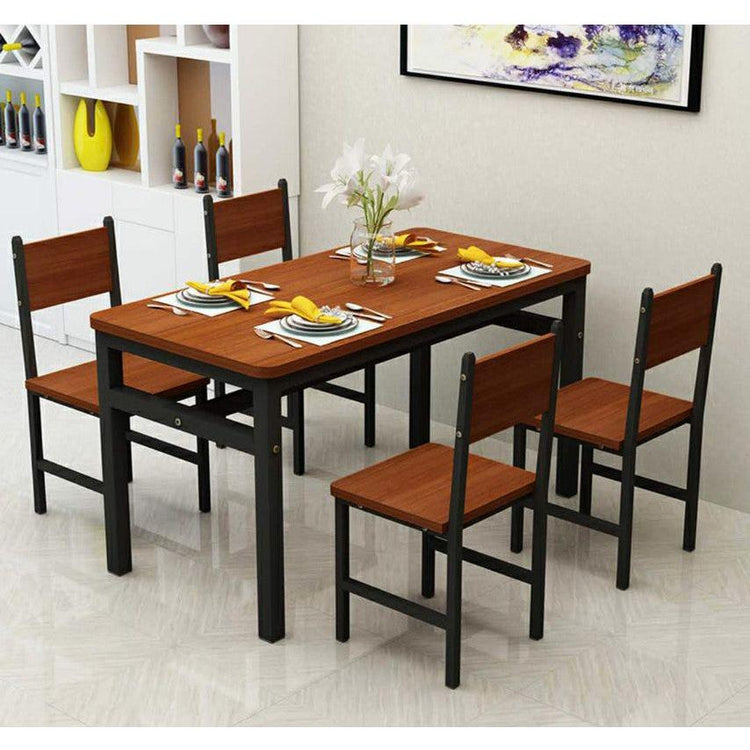 The 5-piece Dining Table & Chairs Set effortlessly merges the inviting warmth of natural wood with a contemporary charm, elevating your living space to new levels of sophistication. Crafted with a seamless fusion of rustic allure and the sleek strength of steel, this deluxe set exudes refined elegance. Its streamlined profile beautifully captures the essence of modern simplicity, creating a captivating centre piece that embodies both style and functionality.