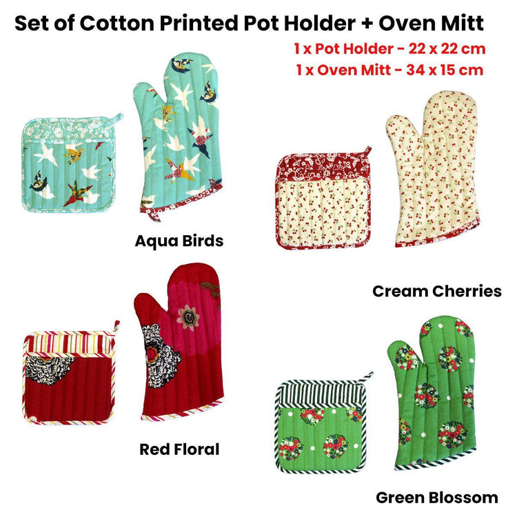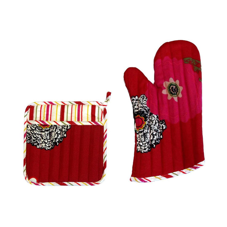 Set of 100% Cotton Printed Oven Mitt + Pot Holder Red Floral
