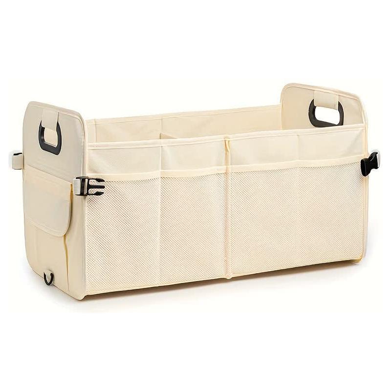 Beige Foldable Car Trunk Organizer - Multi-Compartment Storage Box with Handles