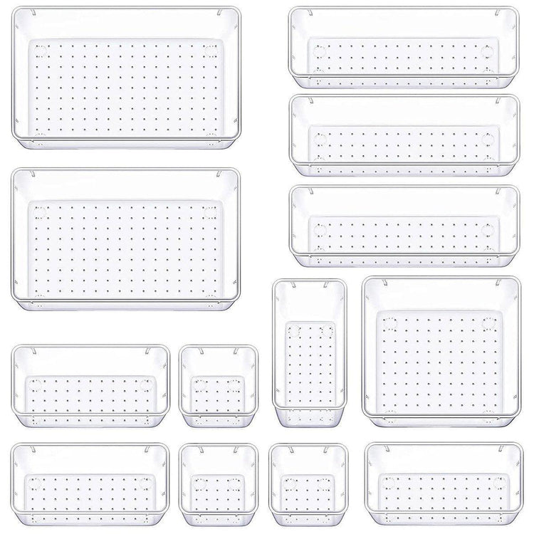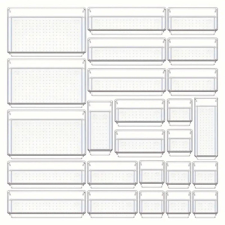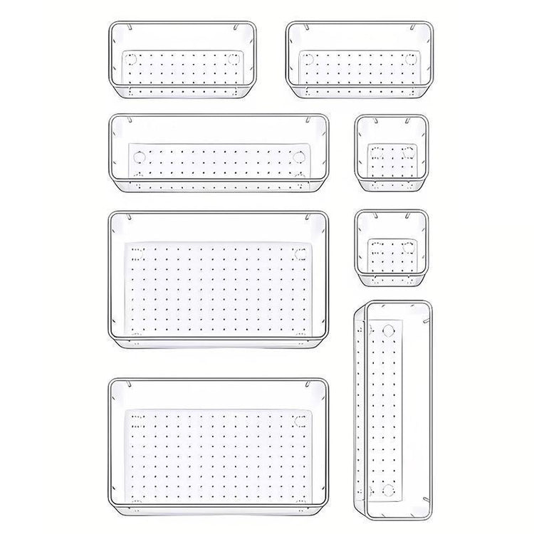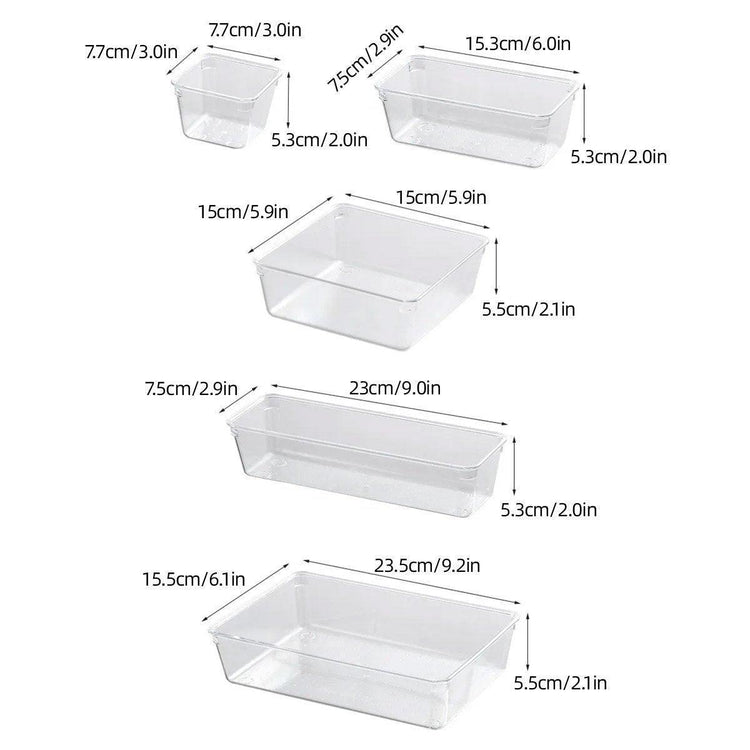 Organise your home or workspace effortlessly with this set of transparent plastic drawer organisers. Available in sets of 8, 13, or 25 pieces, these versatile containers are perfect for storing cosmetics, office supplies, bathroom essentials, kitchen accessories, and more. Crafted from durable plastic, the organisers are stackable and fit seamlessly into most standard-sized drawers, keeping everything neat and within easy reach.
