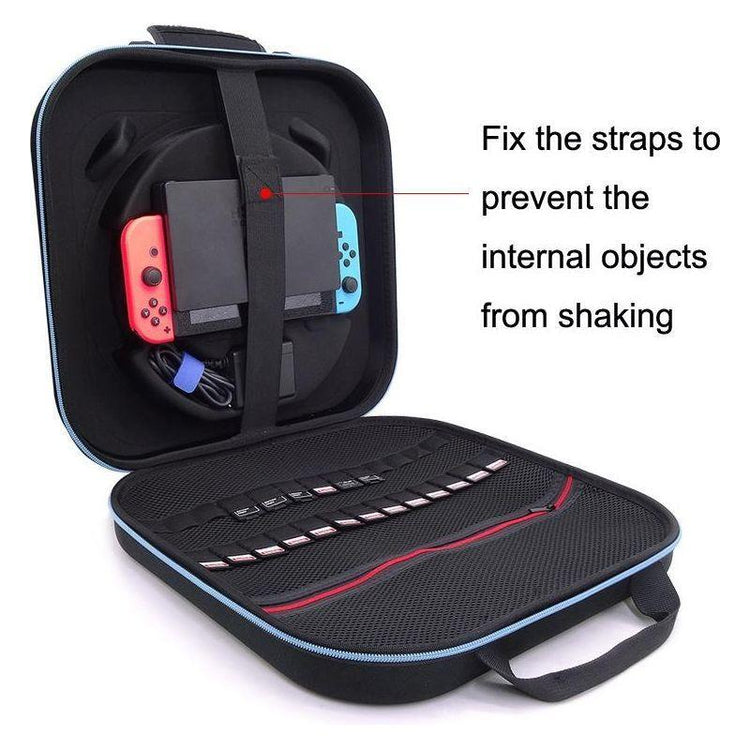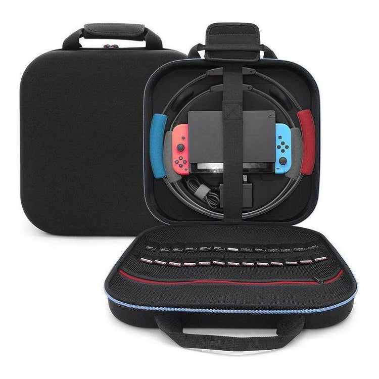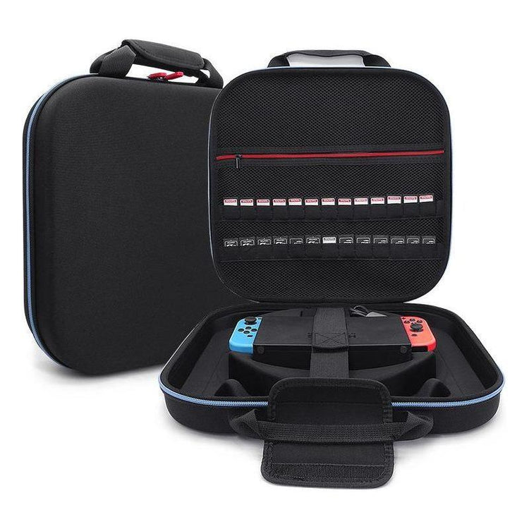 • Large capacity to hold game console, game cards, charger, base, and fitness rings