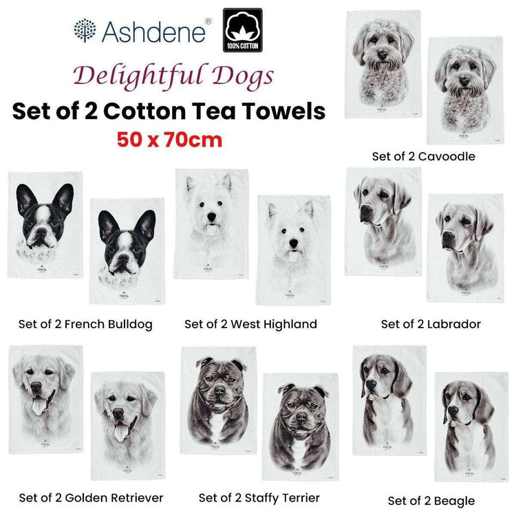 The Set of 2 Delightful Dogs Kitchen Tea Towels 50 x 70 cm celebrates your furry companions with hand painted artworks by talented Lithuanian artist Danguole Serstinskaja. Perfectly capturing the unique personality and characteristics of Australia's most popular dog breeds, presenting life-like, black, white & grey illustrations. Multi-functional kitchen accessory. Detailed dog artwork in a black and white design. Made from 100% cotton - machine washable for easy cleaning. Generously sized to have on display or clean up spills. Ideal for all dog lovers!