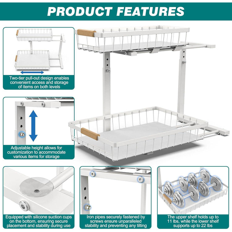 2-Tier Kitchen Under Sink Organiser Storage with Height Adjustable, Unique Slide Rail & Suction Cups for Storage