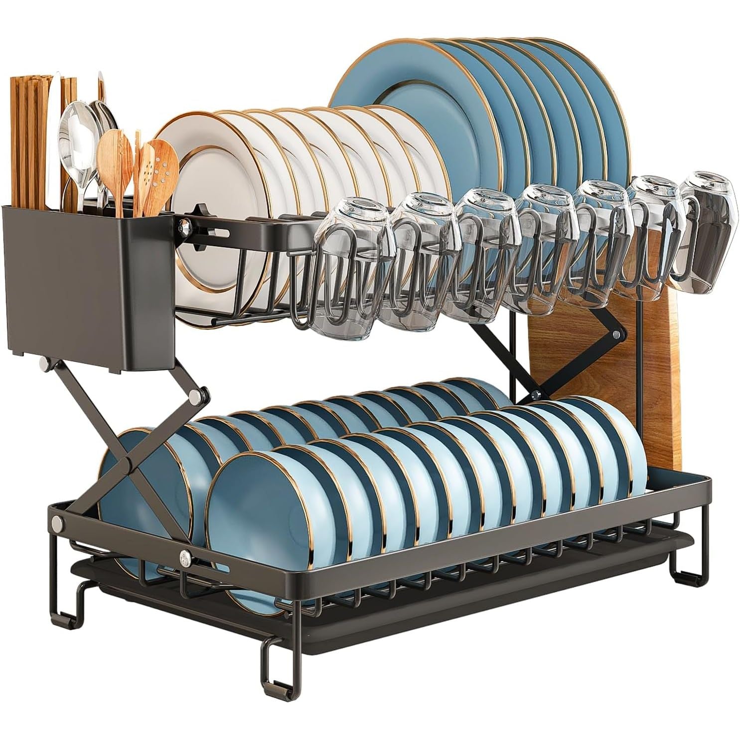 - 2-TIER LARGE CAPACITY DESIGN: Maximize your countertop space with a double-layer structure that holds up to 13 plates on the top rack and 22 bowls on the lower tier. Additional zones accommodate cups, utensils, and cutting boards — perfect for compact kitchens.