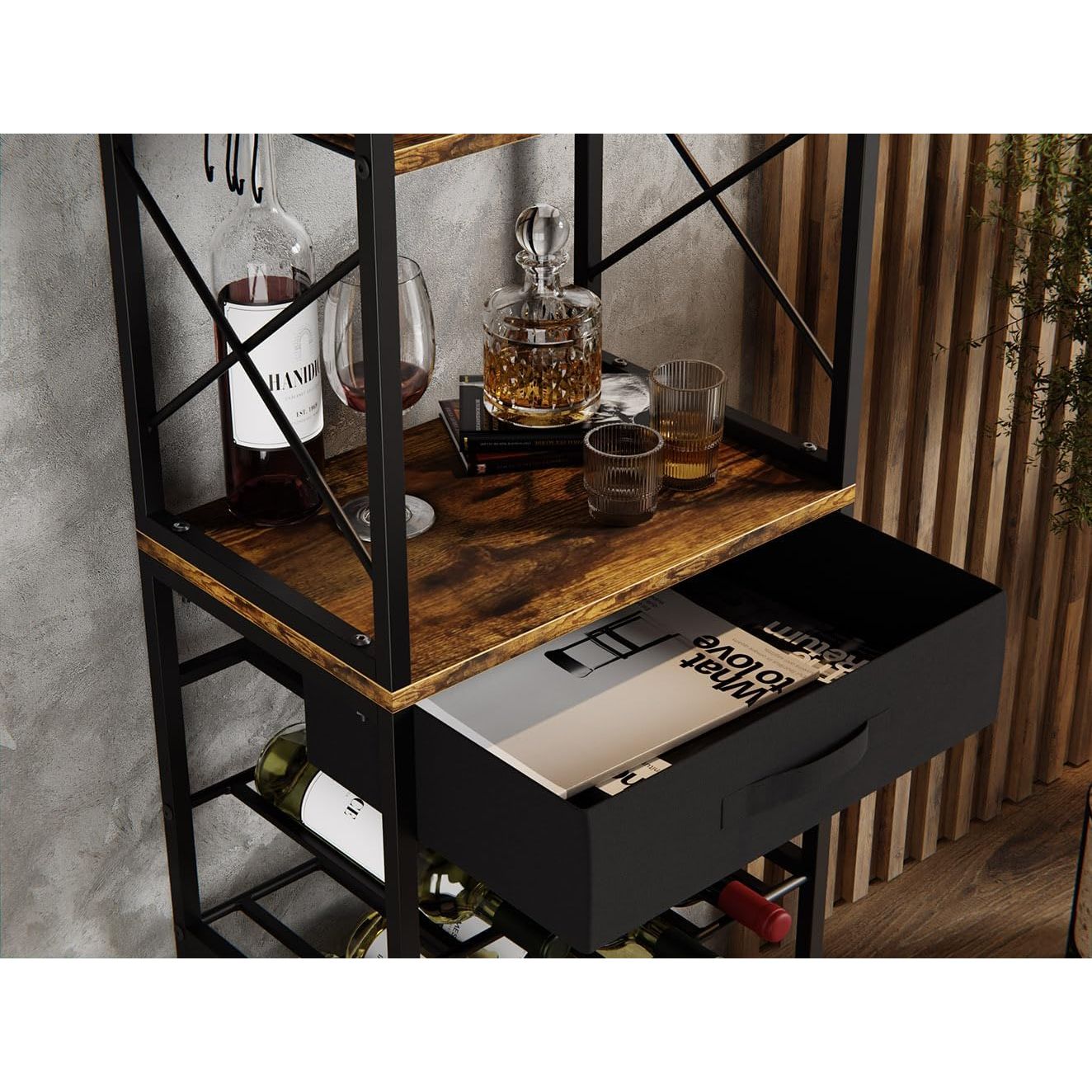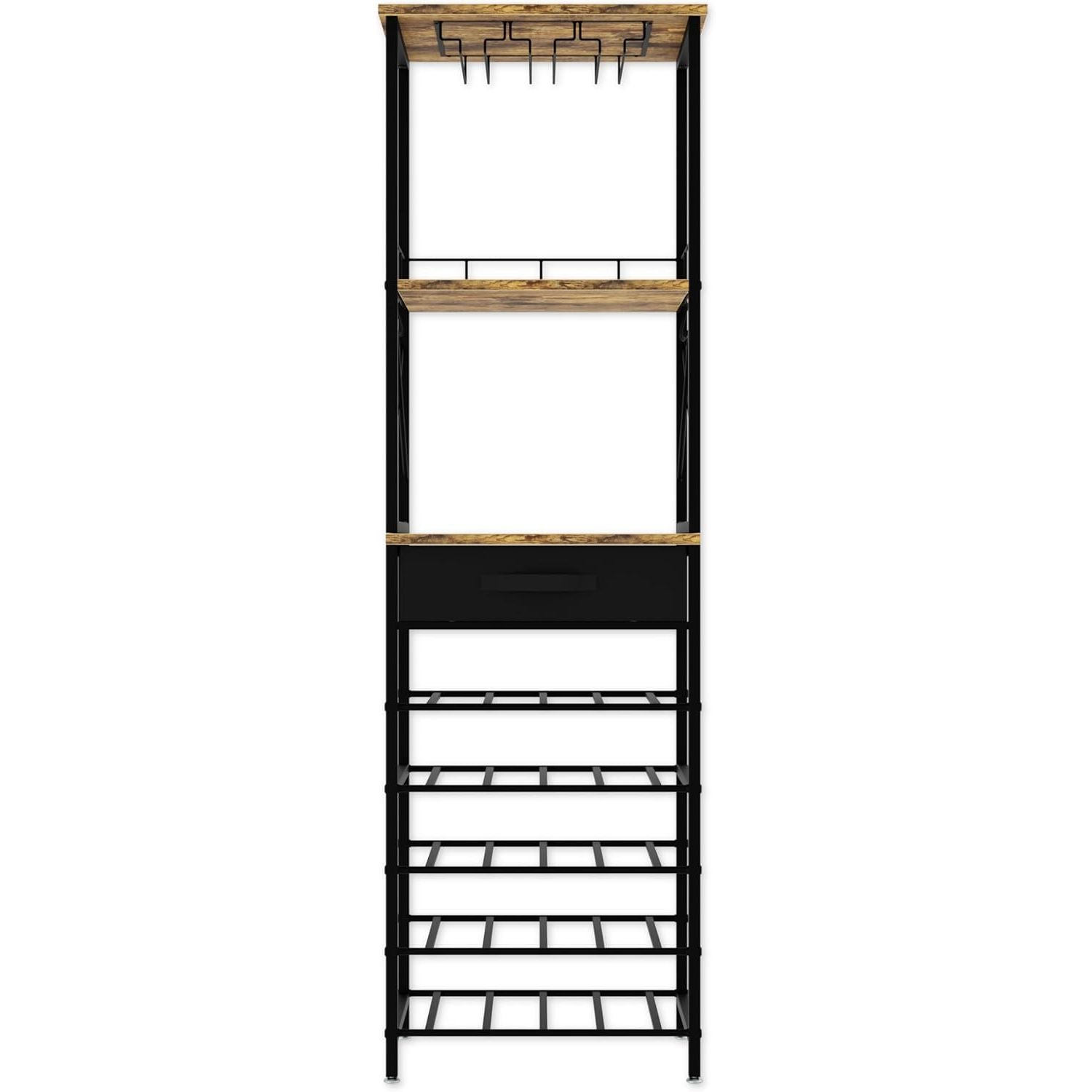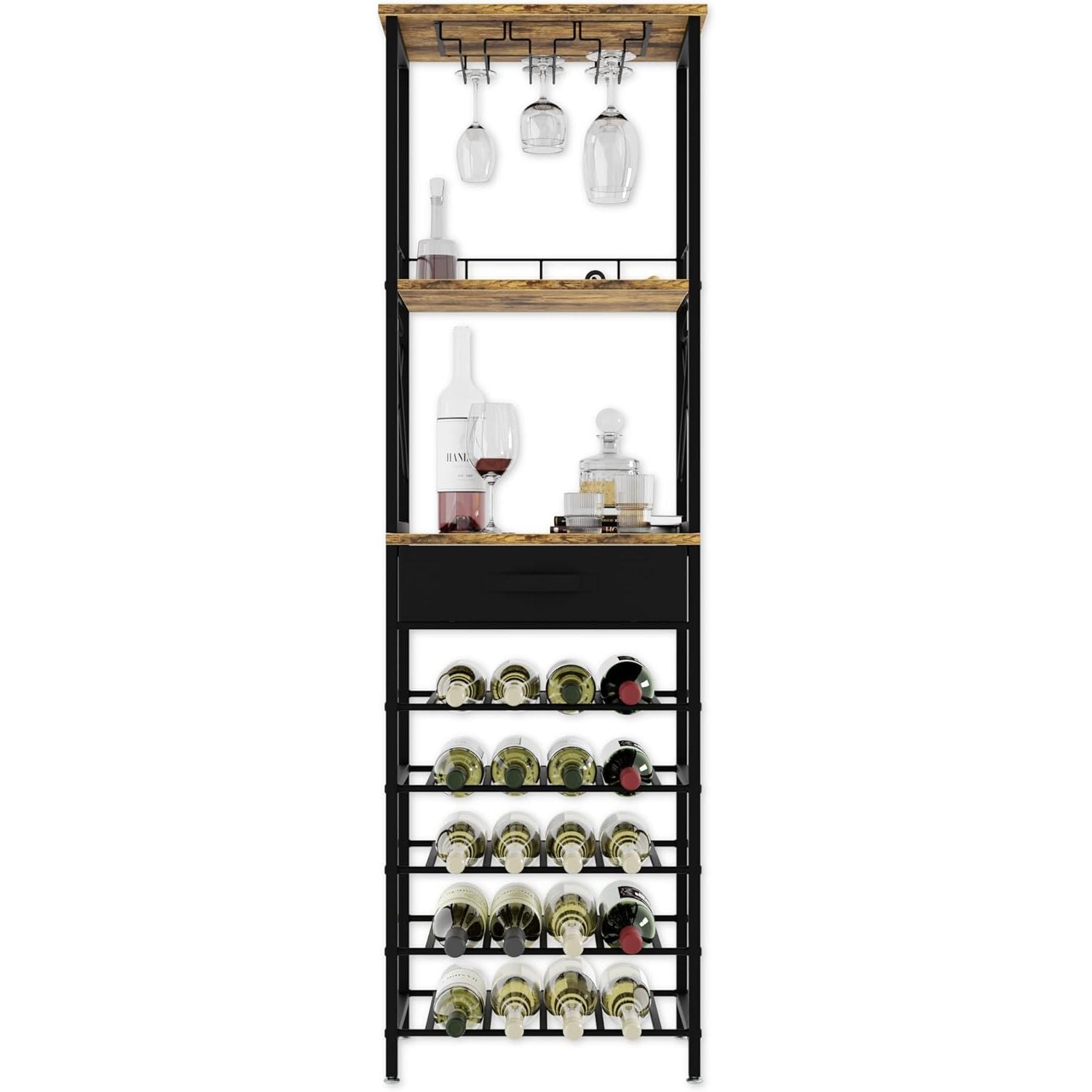 - STURDY & DURABLE CONSTRUCTION: Made from a solid combination of metal and wood, this wine holder provides long-lasting durability. The metal frame ensures excellent stability, while the wooden countertop offers a functional surface for storing wine glasses, corkscrews, or decorative items.