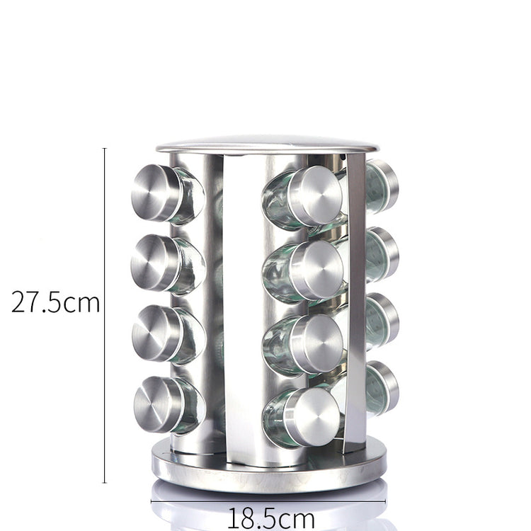 Modern stainless steel round-top rotating spice rack with 16 empty glass jars (88 ml each)