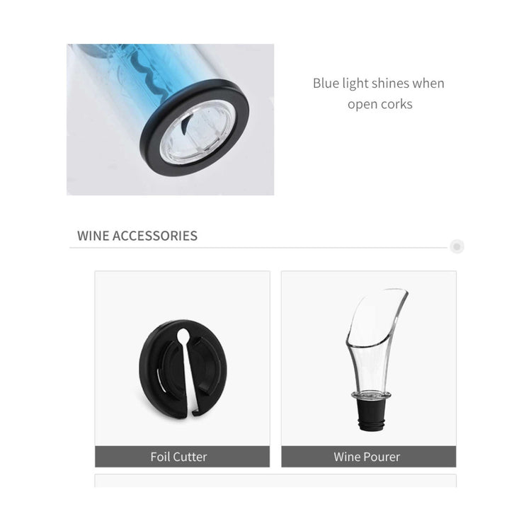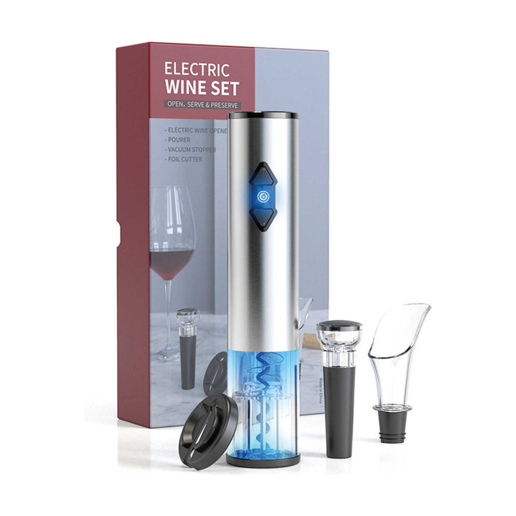 Open, serve and preserve effortlessly open wine bottles and remove corks smoothly with this innovative and automatic LED blue light Electric Wine Opener Set, complete with foil cutter, wine pourer, and manual vacuum pump sealer,