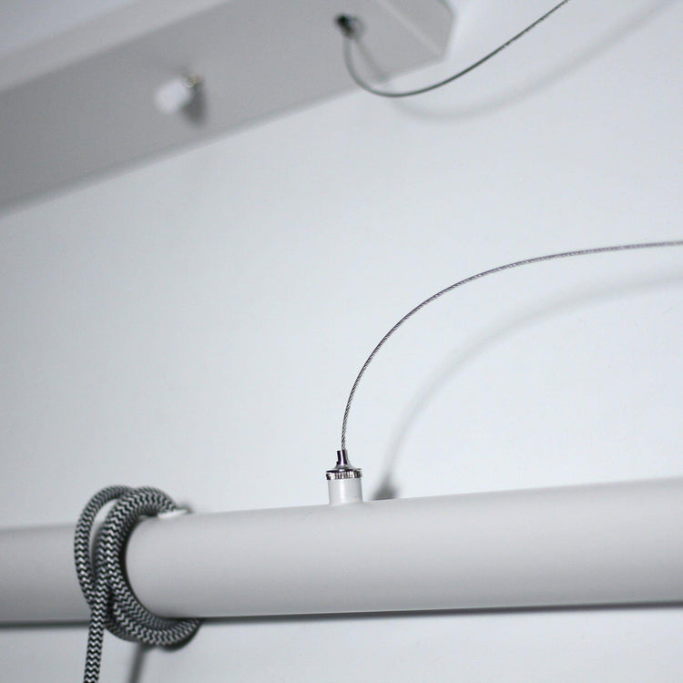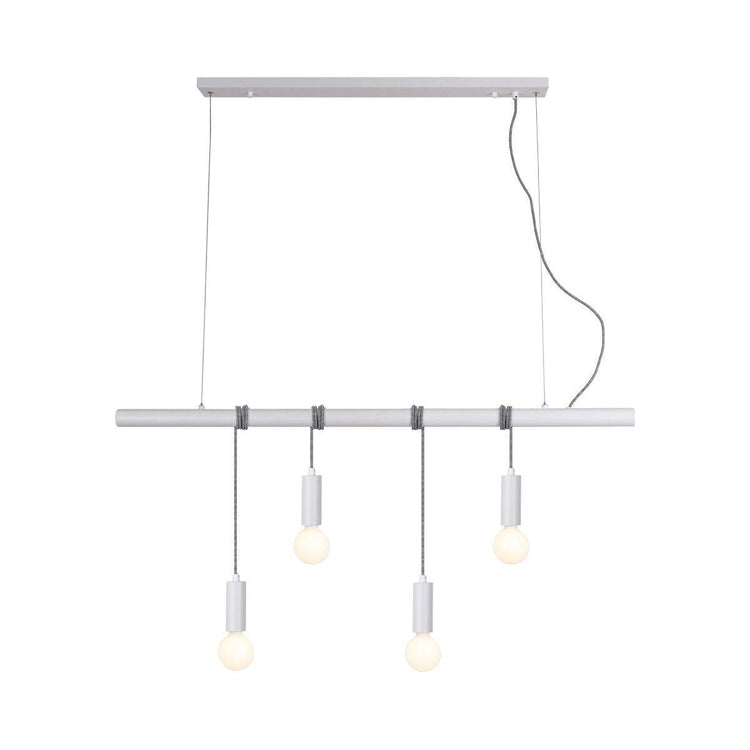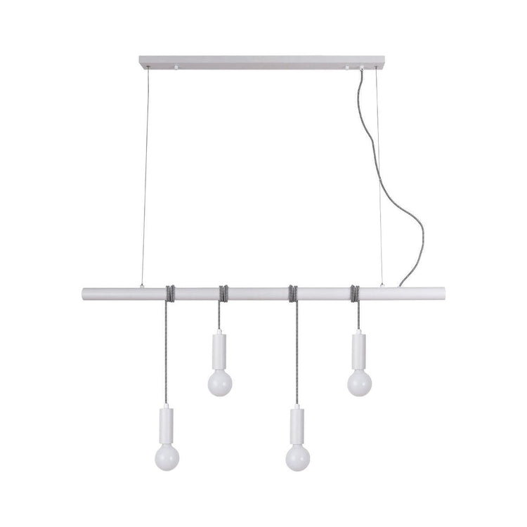 The four globe holders that drop from the lighting bar each have long grey braided cords that can be wrapped around the lighting bar to set heights individually. The heights can set to your preference, whether after a staggered look, or a short non-invasive drop, or a long, purposeful hang. The Bikkel Four Light Pendant comes in black and white and requires four E27 globes.