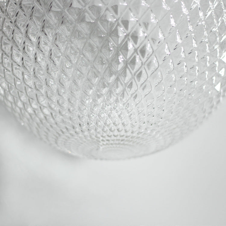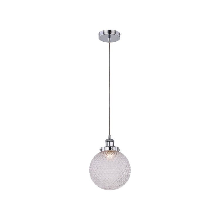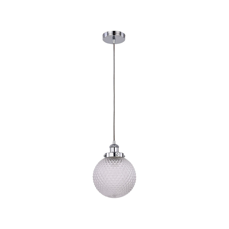 The Casablance Pendant Light offers a classic spherical design that scatters light via a dimpled diamond glass cover. The ceiling mount and main fixture feature a striking chrome finish from which the sphere hangs.