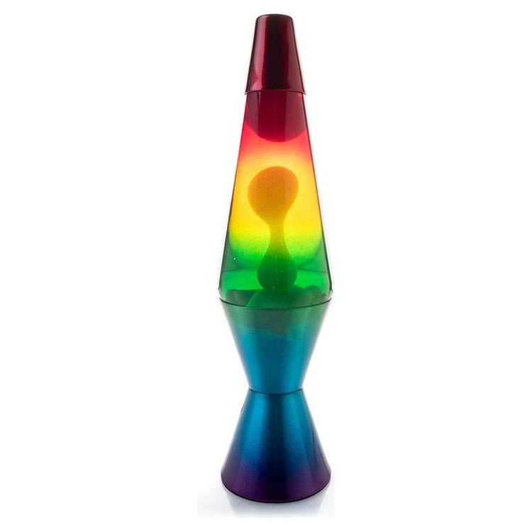- Features rainbow graffiti-style spray painted glass body filled with lava that ripples when lit