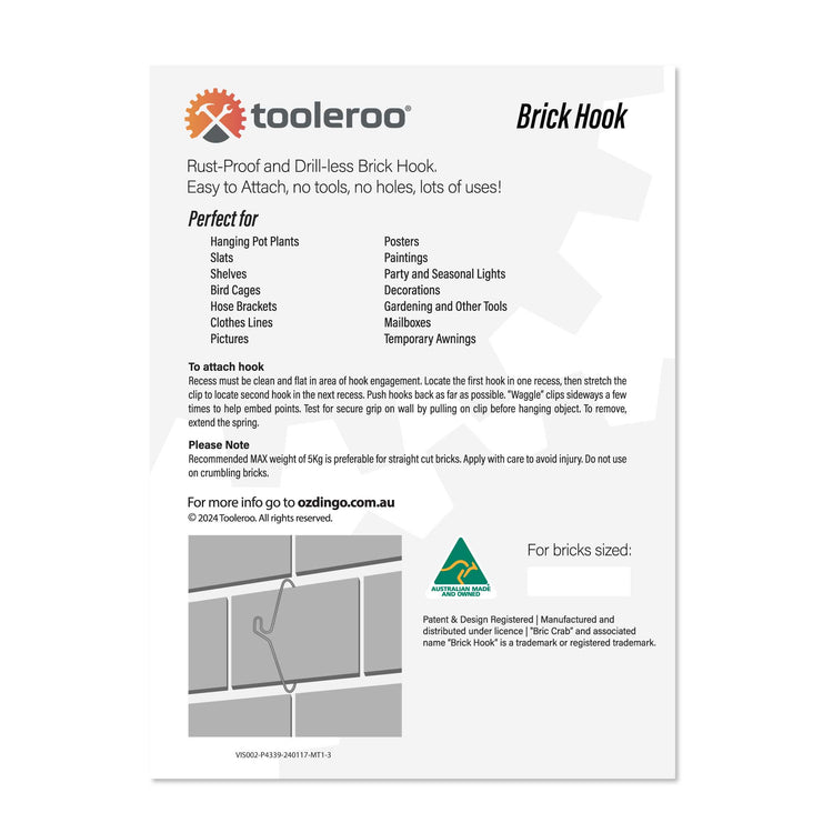 The Brick Hook is an easy to use spring steel clip that you can hang almost anything off your external bricks. Easy to attach to bricks, no tools, no holes and no damage to the exterior of your home.