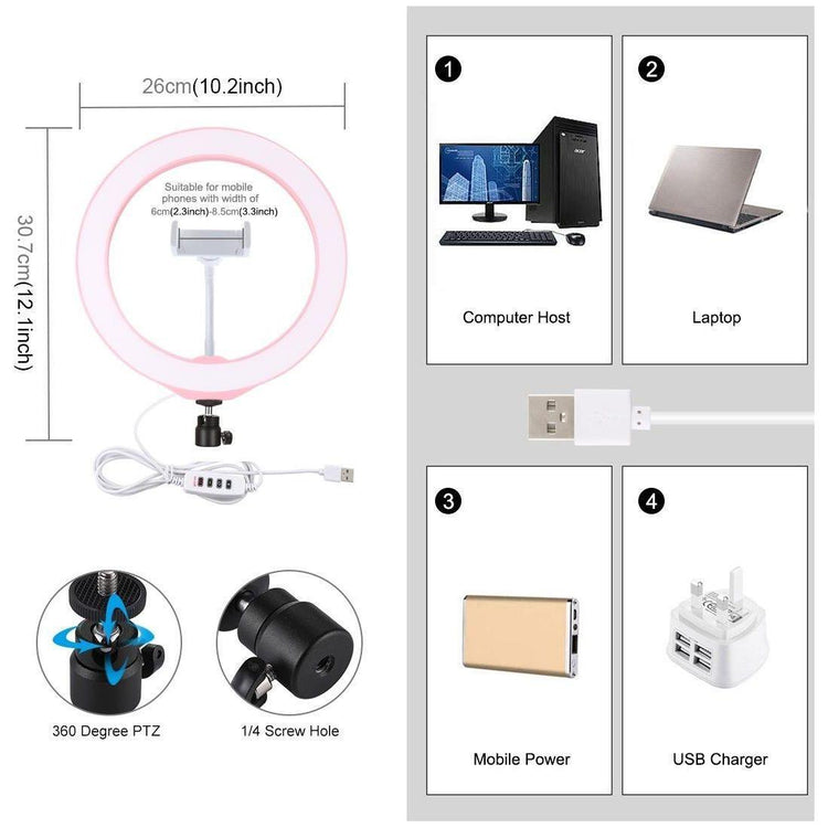 • 1 x 26Cm Usb 3 Modes Dimmable Led Ring Vlogging Selfie Beauty Photography Video Lights With Tripod Ball Head Phone Clamp