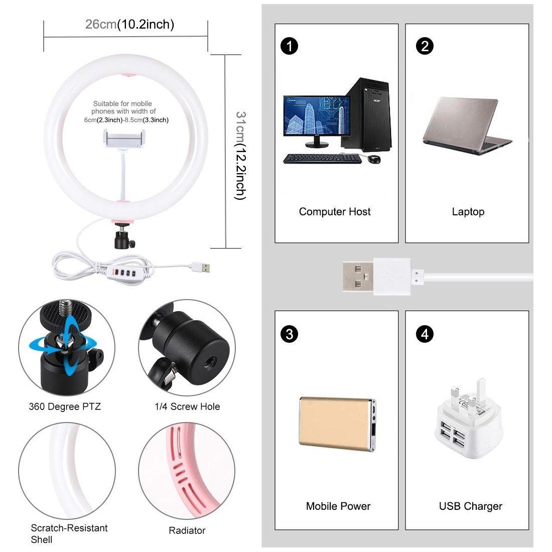 26Cm Usb 3 Modes Dimmable Led Ring Light With Phone Clamp