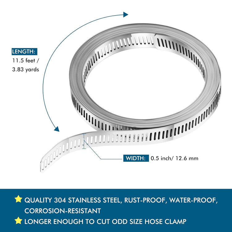 Longer hose clamp: the stainless steel duct clamp strap's total length is 11.5 feet, suitable to cut and get your long large hose clamp in different sizes, such as 12 inch, 14 inch, 16 inch and so on, the max size is 43 inch