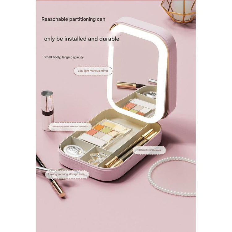 Stay beautifully organized wherever you go with our Portable Jewelry and Makeup Organizer Box. This chic and compact case features an integrated LED fill-light mirror with touch control, providing perfect illumination for makeup application anytime, anywhere. The thoughtfully designed interior offers compartmentalized storage for your jewelry,including dedicated areas for earrings, rings, and necklaces,as well as space for eyeshadow palettes and other makeup essentials. Crafted with a durable exterior and a smooth zipper closure, this travel-friendly organizer keeps your valuables secure and neatly arranged. With USB charging and a long-lasting battery, it's the perfect companion for home use or travel, ensuring you always look your best.