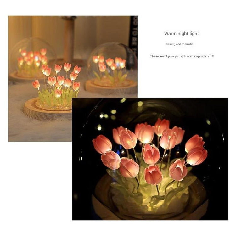 Create a warm and enchanting atmosphere with this Tulip Night Light. This design features delicate tulip flowers encased in a glass dome, complemented by a wooden base. USB powered for convenience, it's the perfect desk decoration and creative gift idea.
