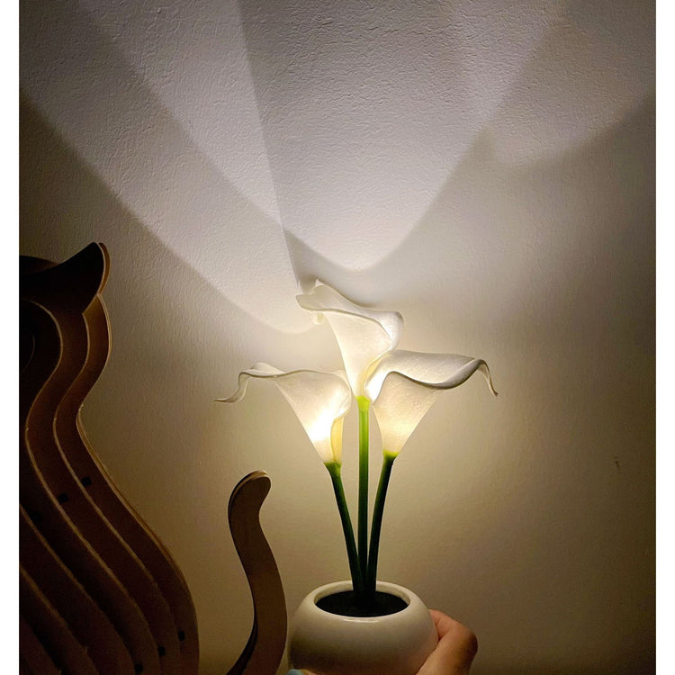 • Elegant & Lifelike Design: Features three beautifully crafted calla lilies made from soft, realistic PU material. Housed in a minimalist, glossy white ceramic pot, this lamp is a work of art that looks just as beautiful when turned off.