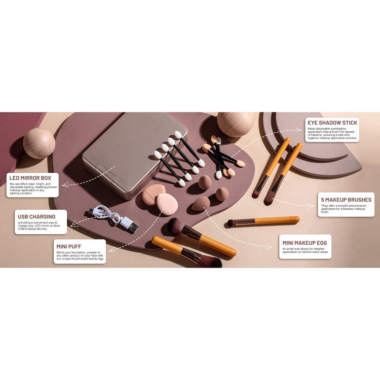 This product contains a lithium battery. Please do not aim the LED light directly into eyes. Fully charge before first use. Makeup brushes, sponges, and other accessories shown in the images are for illustrative purposes; the exact contents, quantity, and style of tools may vary depending on the specific kit selected. To clean tools, use mild soap and water and let them air dry completely.